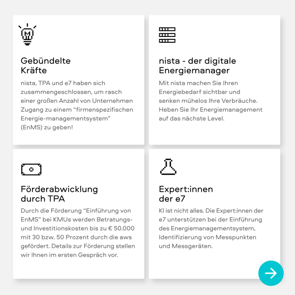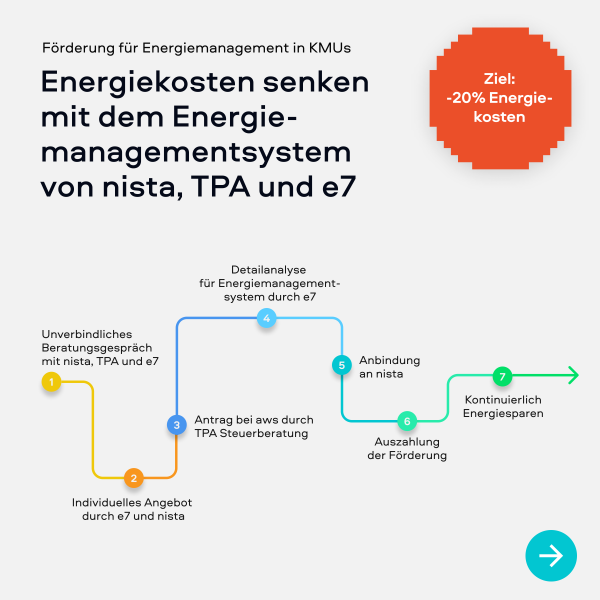 Nach einem unverbindlichen Beratungsgespräch und einer Angebotsunterbreitung, kümmert sich TPA um die Beantragung der Förderung „Einführung von EnMS" bei der aws. Durch das Programm können 30 bzw. 50% der Beratungs- & Investitionskosten von bis zu 50.000€ gefördert werden. Dann kommen die Expert:innen von e7 ins Spiel, führen eine Detailanalyse durch und geben Hilfestellung bei der Implementierung des Energiemanagementsystems, sowie dem identifizieren von Messpunkten. Anschließend folgt die Anbindung an nista, den digitalen Energiemanager, welcher den Energiebedarf der KMU sichtbar macht und es so erleichtert den Verbrauch zu senken. Das Ergebnis ist eine kontinuierliche Energieersparnis.