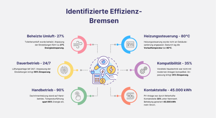 Hier sehen Sie Beispiele für (zum Teil typische) Effizienz-Bremsen, die wir bei unseren Energieaudits aufgedeckt haben. Ob Klassiker oder Einzelfall, hier zeigt sich, wie mit einfachen Maßnahmen enorme Einsparungen erzielt werden können.