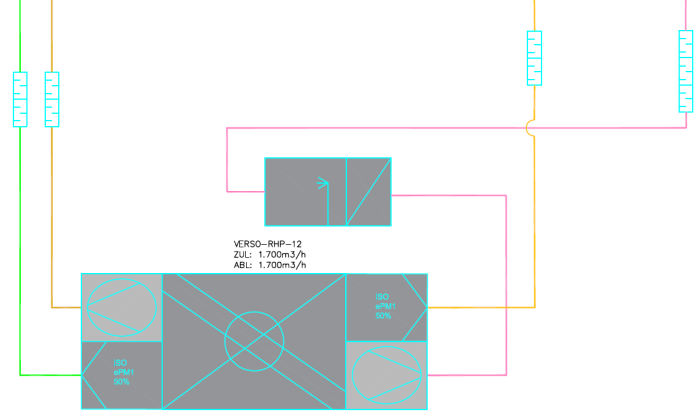 Die zu Büro-Lüftungsanlage (Nennluft-Volumen 1.700 m³/h) ist mit einer integrierten Wärmepumpe ausgestattet, die sowohl im Heiz- als auch im Kühlbetrieb arbeitet. Die Wärmepumpeneinheit ist als Teil des Lüftungsgeräts verbaut und besteht aus einem Rohrleitungssystem mit Kältemittel, Kompressor, zwei Register (Verflüssiger und Verdampfer). Die Wärmepumpe wird automatisch aktiviert, wenn der Rotationswärmetauscher nicht in der Lage ist, die gewünschte Temperatur zu erreichen. Weiters verfügt die Lüftungsanlage über eine elektrische Dampf-Befeuchtungseinheit zur Zuluft-Befeuchtung.