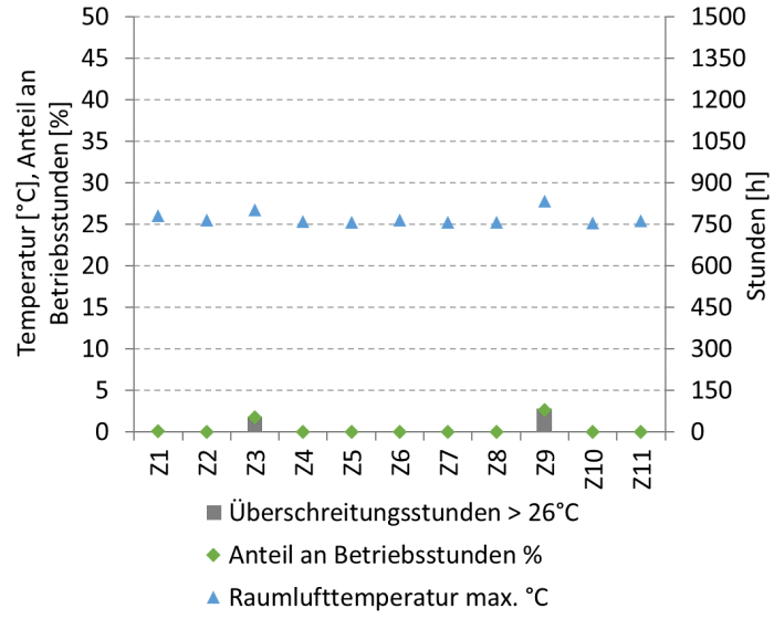 Raumlufttemperatur > 26°C mit Lüftungsgeräte 3 und Fußbodenkühlung