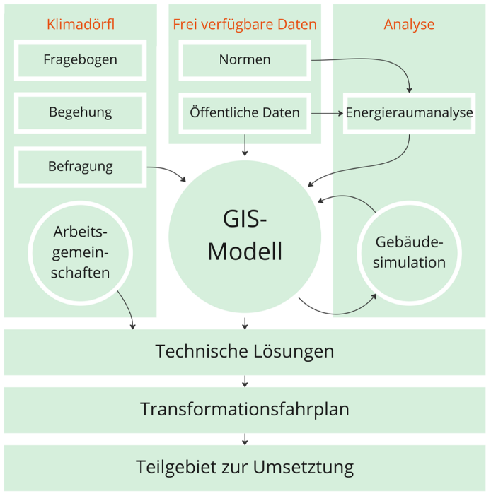 Die gesammelten Daten, sowie Ergebnisse der Energieraumanalyse bieten die Grundlage zur Simulation verschiedener Gebäudetypen. Diese wurden ebenfalls in das GIS-Modell eingespielt. Das gesamte GIS-Modell bildet somit eine Grundlage zur Erarbeitung technischer Lösungen sowie eines Transformationsfahrplans.